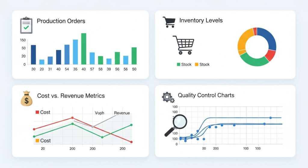 - تخطيط الإنتاج: تحديد الكميات المطلوبة من المواد الخام ومواعيد التشغيل بدقة لتفادي الهدر أو التأخير.
