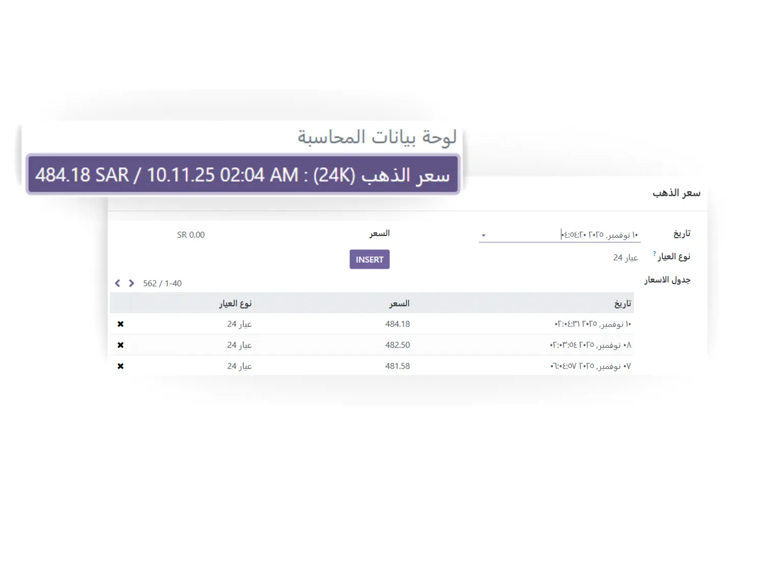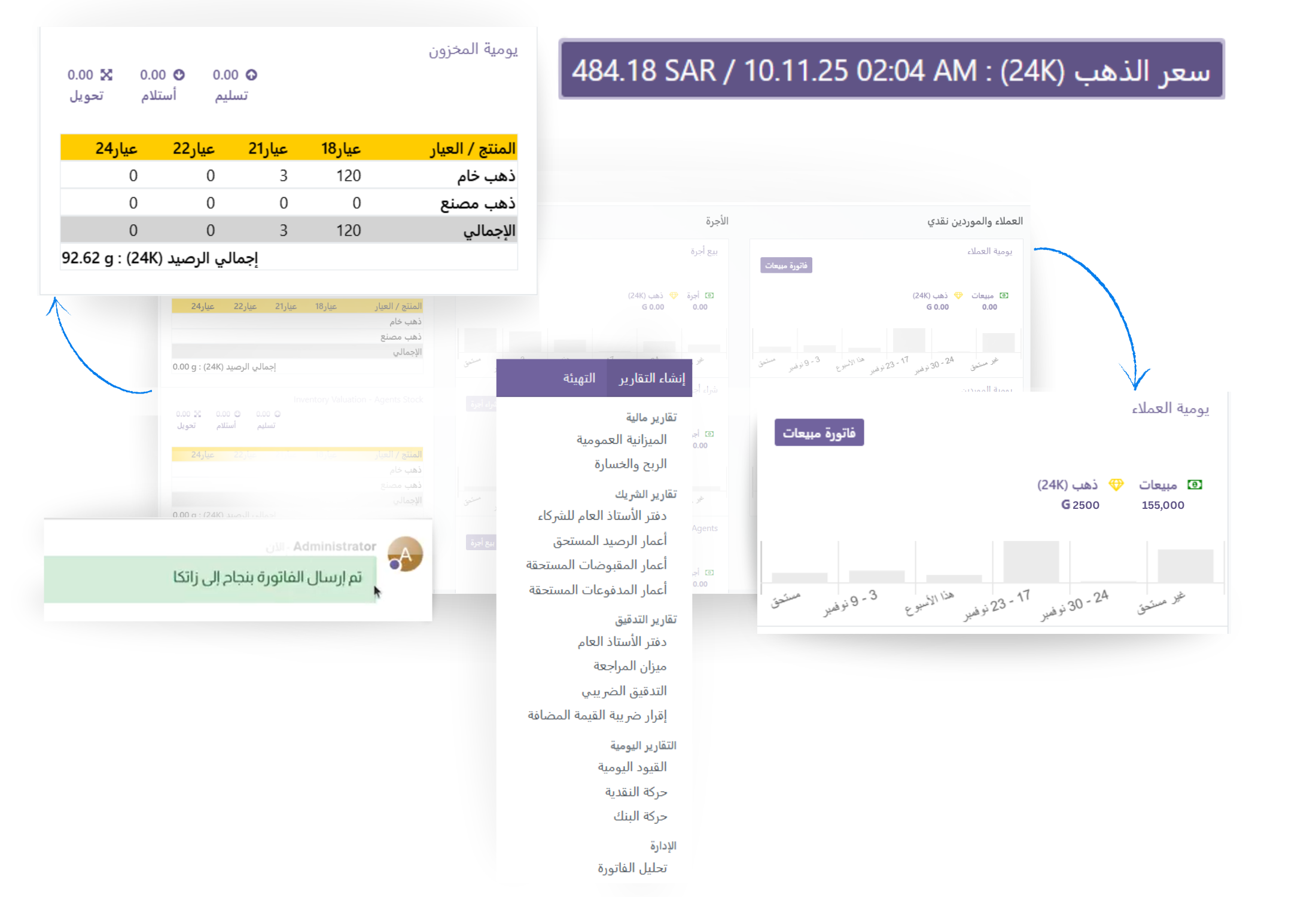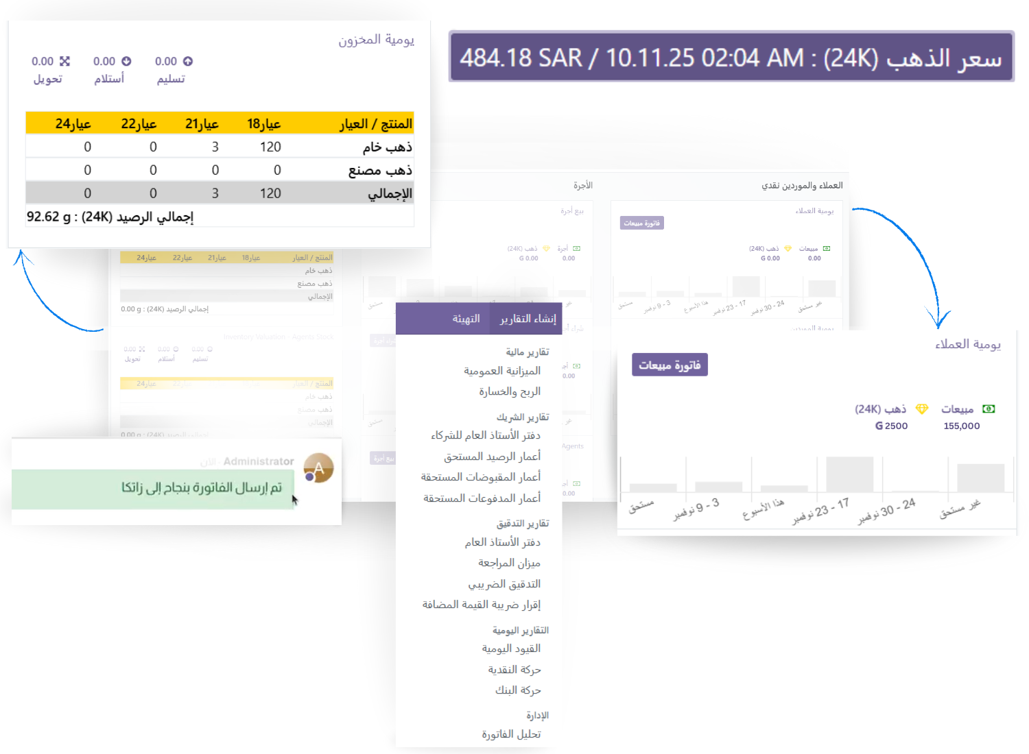 يدير جميع عمليات البيع والشراء بالذهب والنقد بدقة وسهولة، من إدارة عمولات البائعين، وعمليات التصنيع، إلى شراء واستبدال الذهب، كل ذلك في نظام واحد معتمد من هيئة الزكاة.